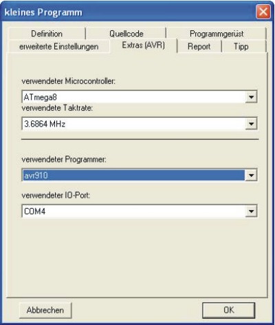 Kontrollieren Sie die Einstellungen in SiSy AVR. In der Definition zum Objekt "kleines Programm" müssen auf der Registerkarte "Extras AVR" als Programmer der "AVR910" (myAVR Board MK2 USB) oder der "sp12" (myAVR Board MK1 LPT) eingestellt und der entsprechende COM-Port ausgewählt sein.